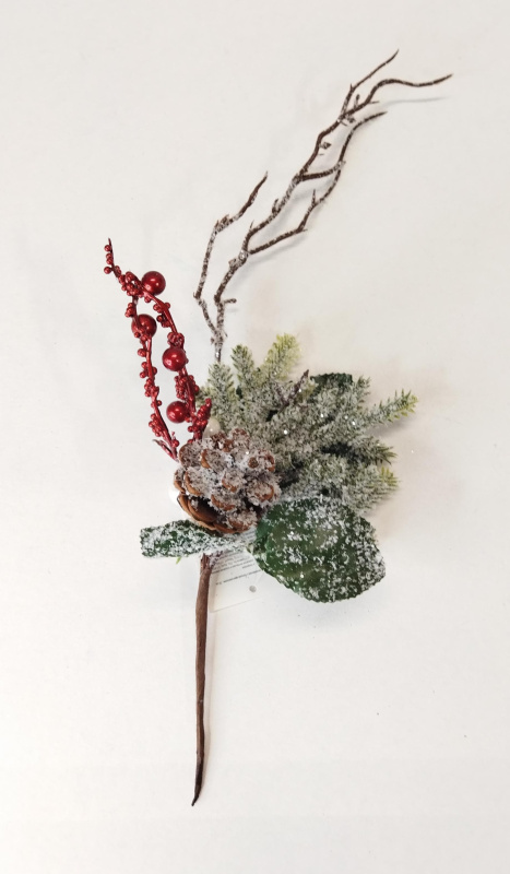 Ветка декоративная заснеженная с белыми жемчужинами 39 см