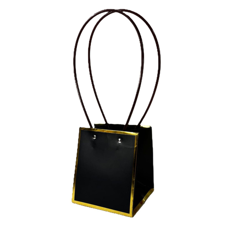 Пакет под цветы 13*13*15см Квадрат Черный с Золотой каймой и пластиковой ручкой