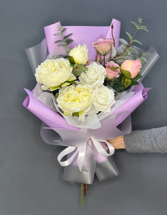 Быстросборная упаковка Форма №2. Цвет: матовая чередуется с сирен пленкой, размер букета:в55,ш25
