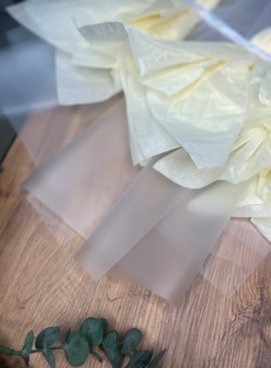Быстросборная упаковка.Форма№2. Цвет: матовая с крем тишью,размер букета: +/- в55, ш25