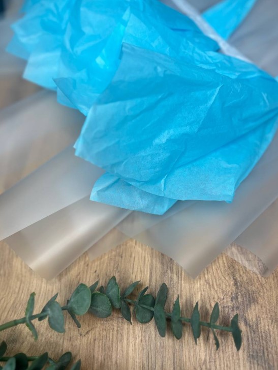 Быстросборная упаковка Форма №5. Цвет: матовая пленка с голубой тишью,размер букета:в50,ш40